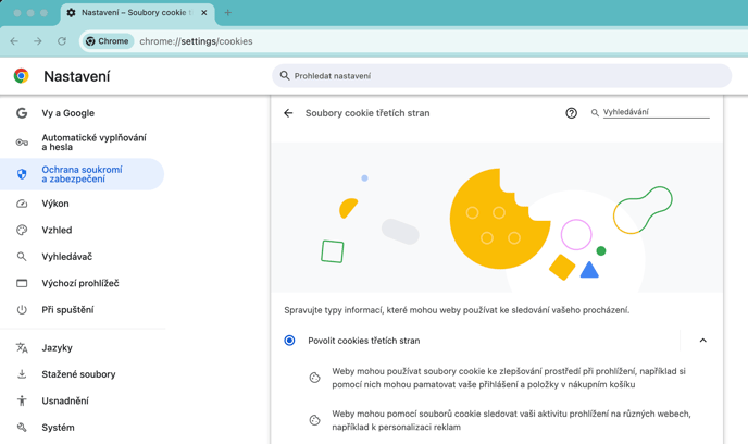 - V nastavení Chrome povolte soubory cookie třetích stran: